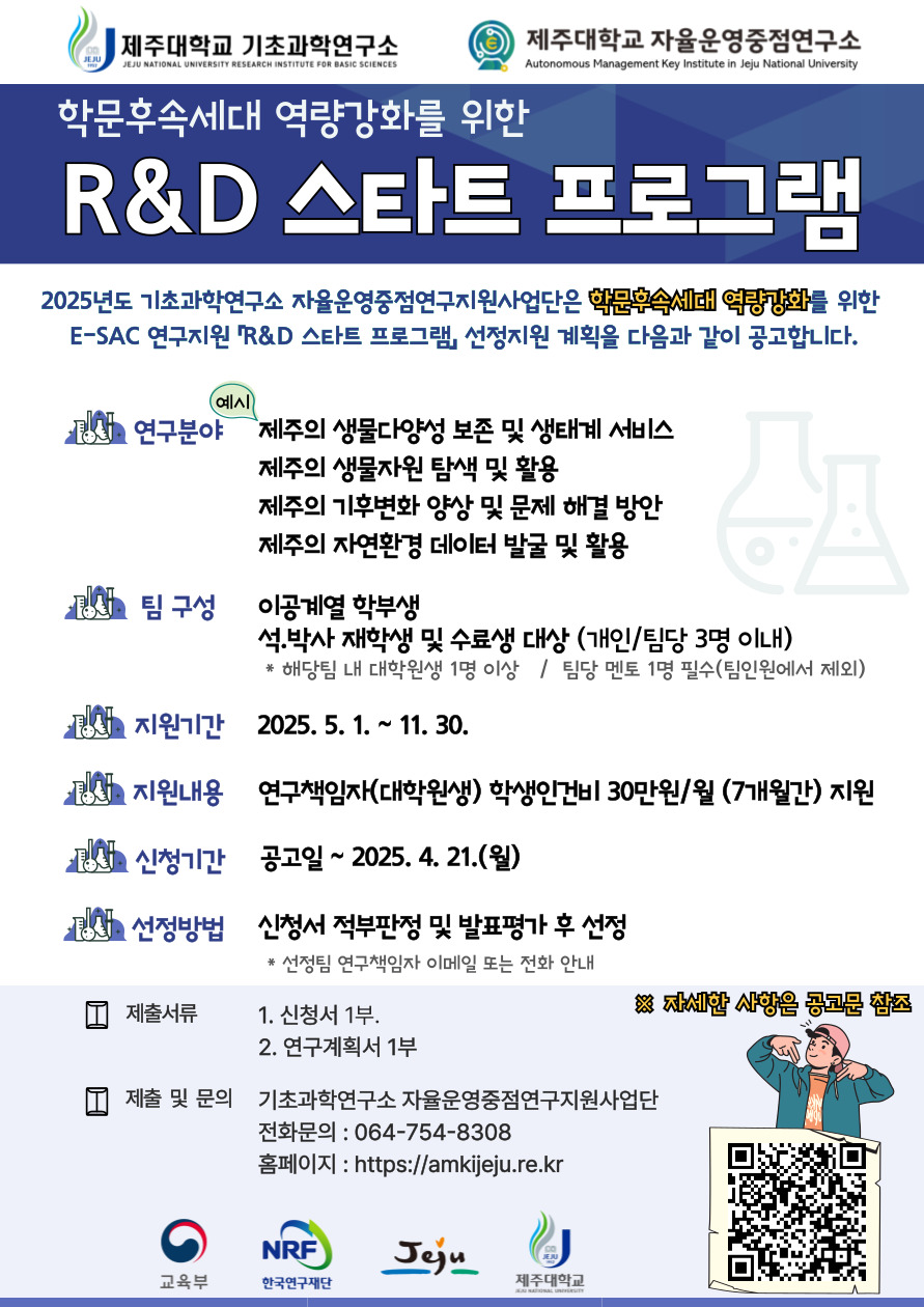 기초과학연구소 자율운영중점연구지원사업단에서는 학문후속세대의 연구 역량 강화를 위해 『2025 R&D 스타트 프로그램』을 아래와 같이 운영하오니 많은 참여 바랍니다.